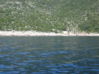 Aztán láttunk delfineket is (erre nagyobb az esély, ha vitorlázunk, azaz, nem megy a zajos motor), amit fotózni nagyon nehéz, mert a kis ravaszok SOHA nem akkor jönnek a felszínre, amikor az ember várja, illetve a reakació idő + zársebesség garantálja, hogy mint itt lent, épp csak az uszonyuk hegyét sikerüljön elkapni (itt a kép közepétől kissé jobbra látható egy vékonyka vonal....na AZ a delfin ;-))))